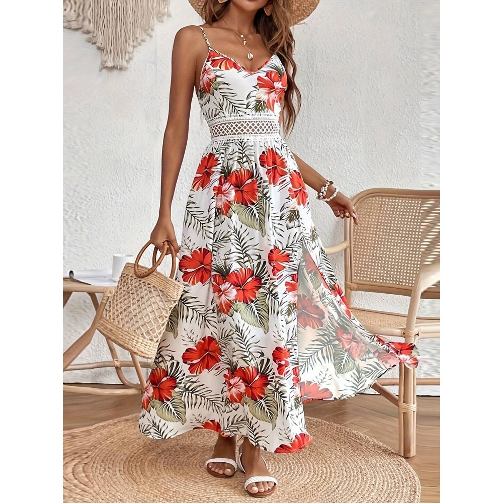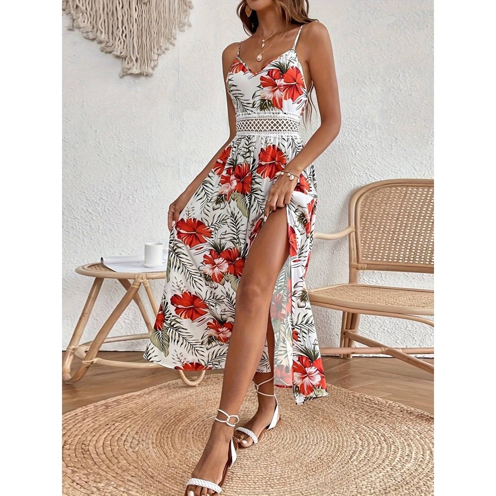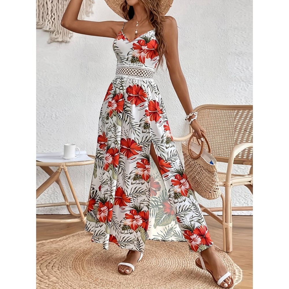 Women's 2025 Summer Boho Chiffon Floral Print Lace Cami Maxi Dress Sleeveless V-Neck Split Thigh Beach Wedding Resort Dress Vacation Retro Style Dress