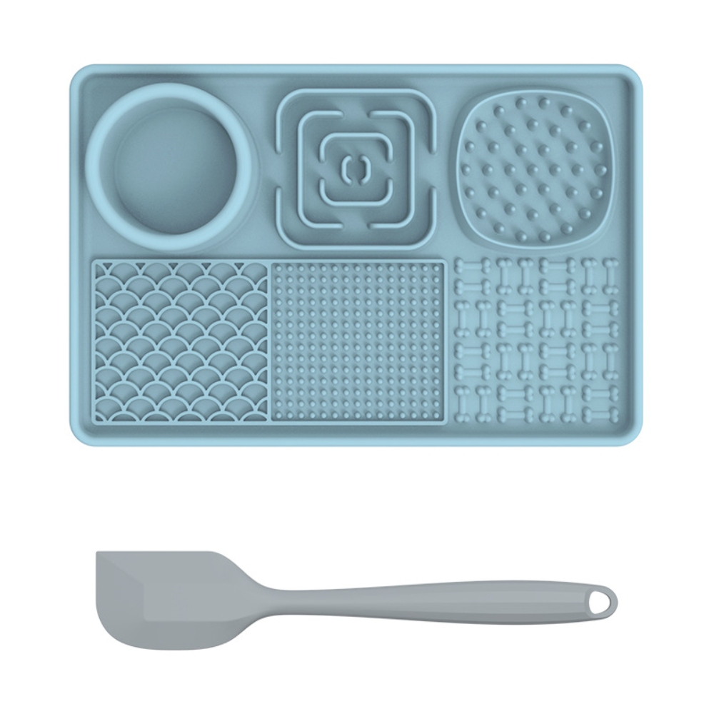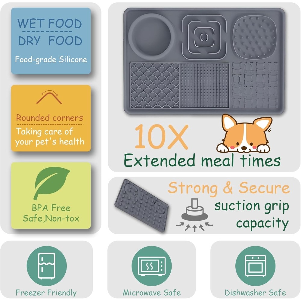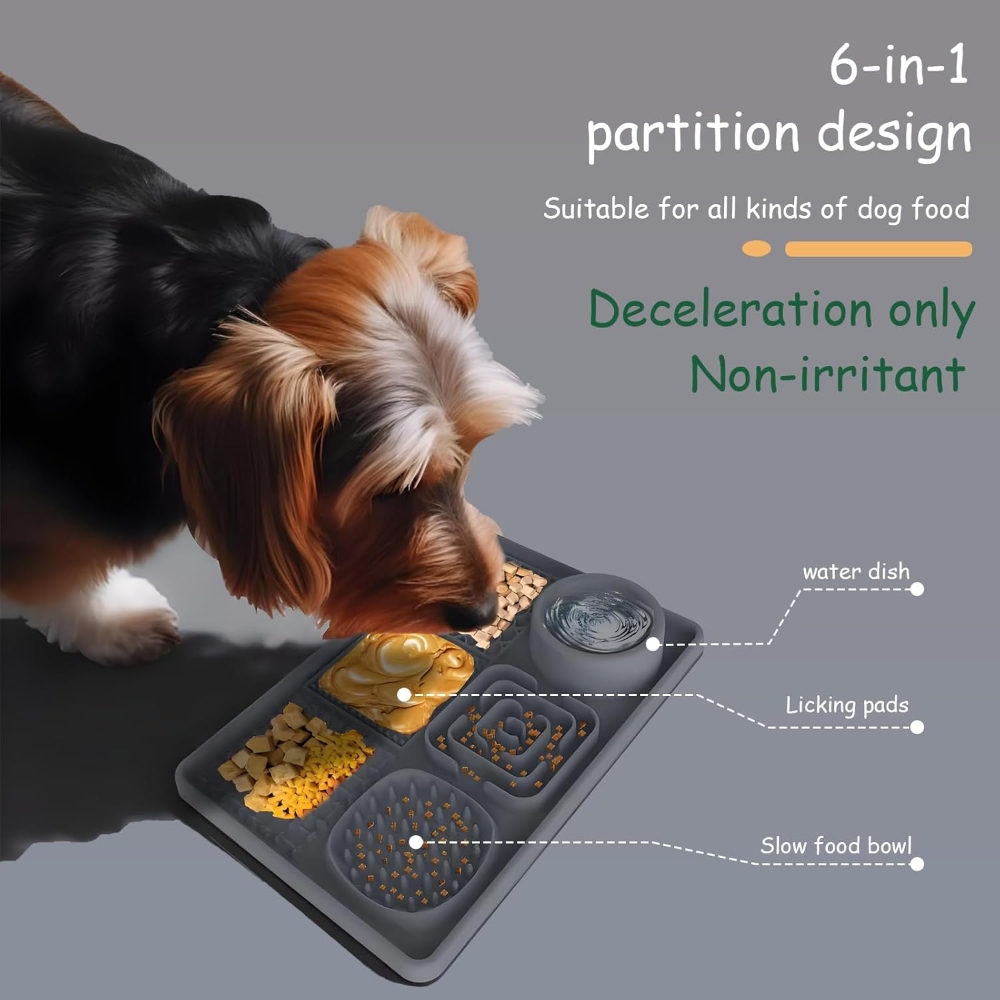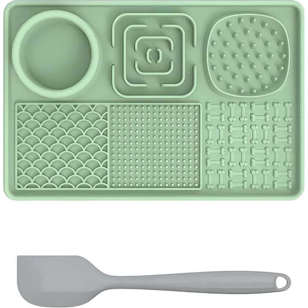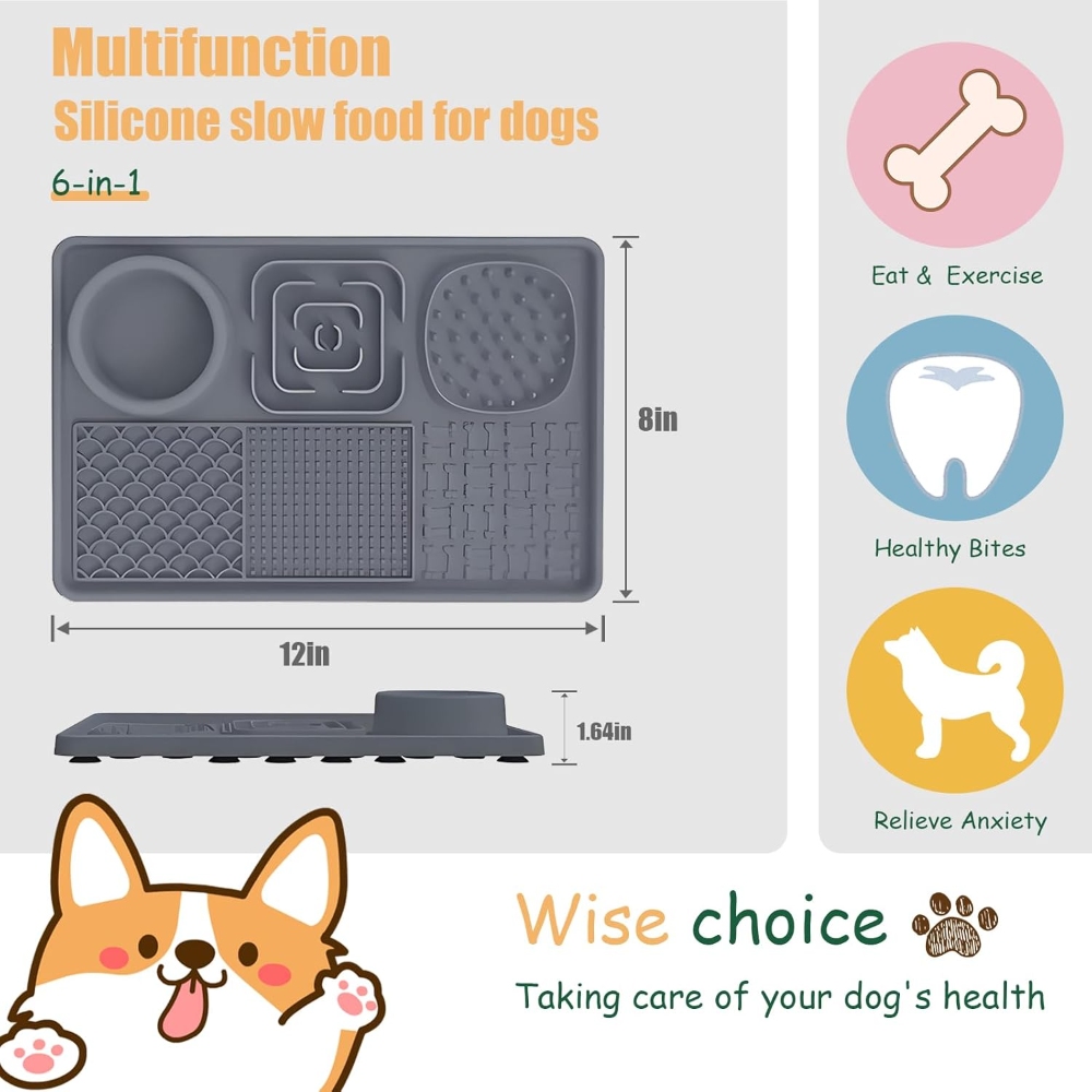 【Safety Material-Food Graded Silicone Lick Mat】This slow food licking mat made of non-toxic food-grade silicone which meet pet food safety, high temperature resistance, sturdy and durable, bite-resistant, highly flexible and will not break, easy to use to ensure your pet safe use. 【Slow Feeding Lick Pad- Improves Digestion, Relieve Anxiety】Some studies have shown that slow eating contributes to a dog's health. The feeding mat can effectively slow down the feeding speed of pets and extend the feeding time. Improve pet eating habits and digestive problems, prevent pets from overeating, indigestion, vomiting and bloating. The licking mat also can help dogs release endorphins, relieve anxiety, and inhibit destructive behavior. A perfect gift for your dogs. 【6-Quadrant Design-For Different Food】This lick mat designed with 6 areas different pattern designs, suitable for different foods. Designed with a water bowl and 2 slow food areas to put solid food such as dog food, snacks, beef jerky... 3 different licking areas can be applied with different liquid foods, such as yogurt, peanut butter, etc. The lick mat not only make a slow feeding to calm your pet but also clean pet’s tongue and teeth. 【Lick Mat with Suction Cups & Easy to Clean】The Dog Slow Feeder Pad designed with many suction cups which can be stick on different materials such as hardwood,tile,glass,fridge. The dog lick pads tightly adsorbed on floor to avoid from sliding and spillage or stick to the shower wall to make sure easier bathing. The slow feeder mat is super easy to clean, no matter hand wash or dishwasher. We sent a spatula and brush for cleaning crevices and hygienic dead spots. 【Great Customer Service】Our slow feeding pad have 5 different color
