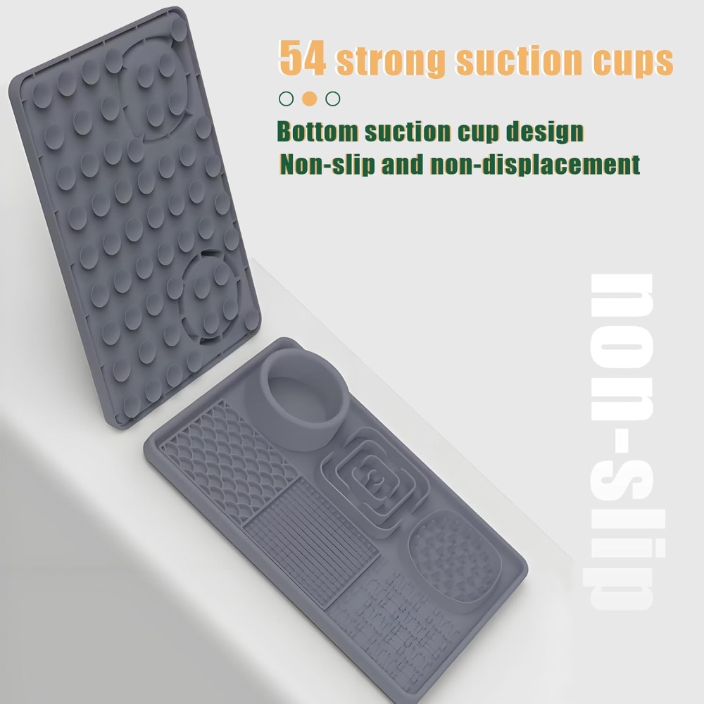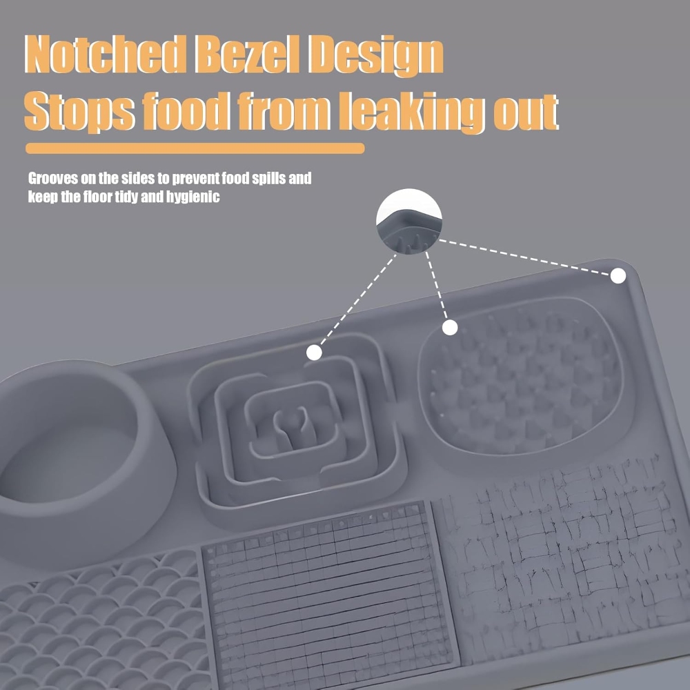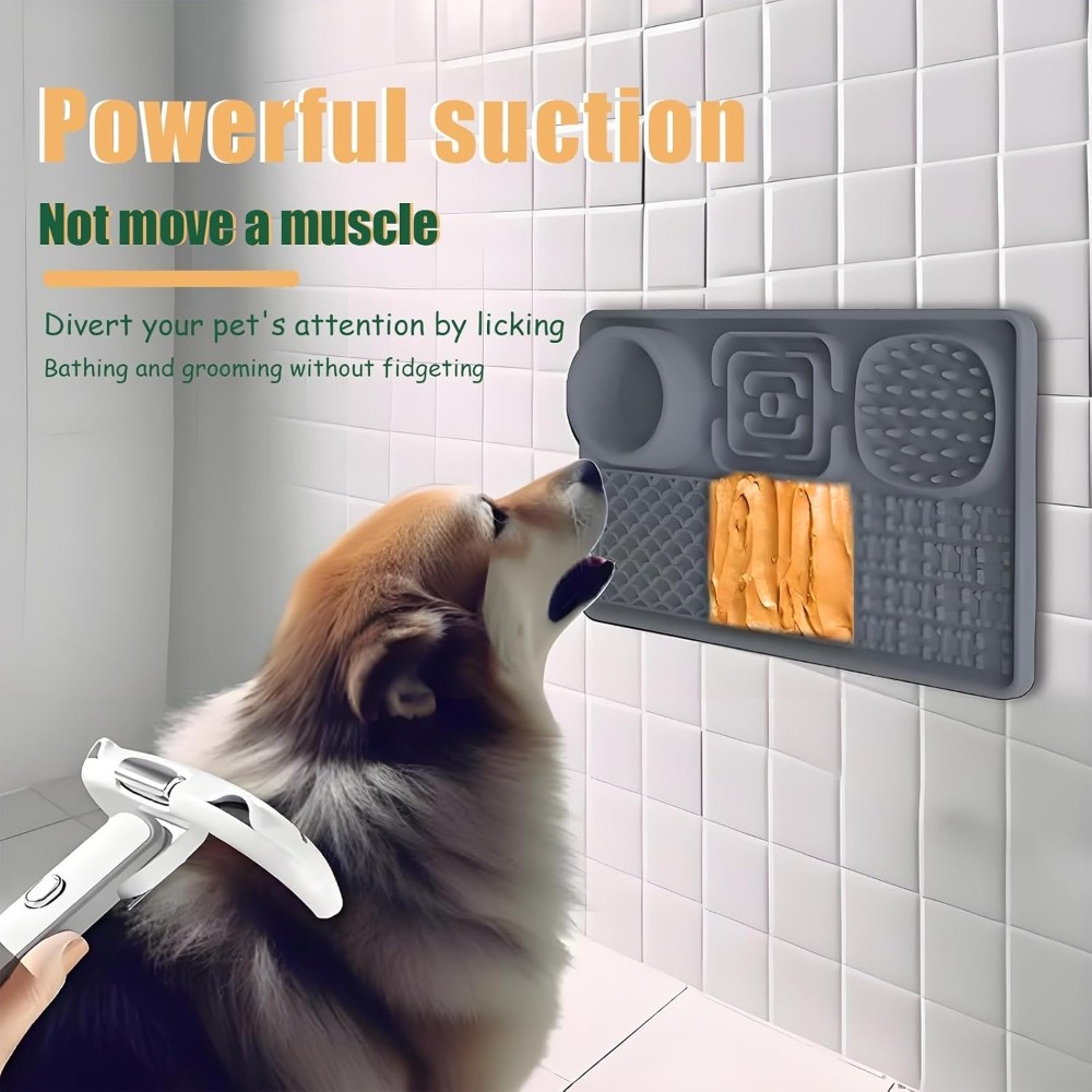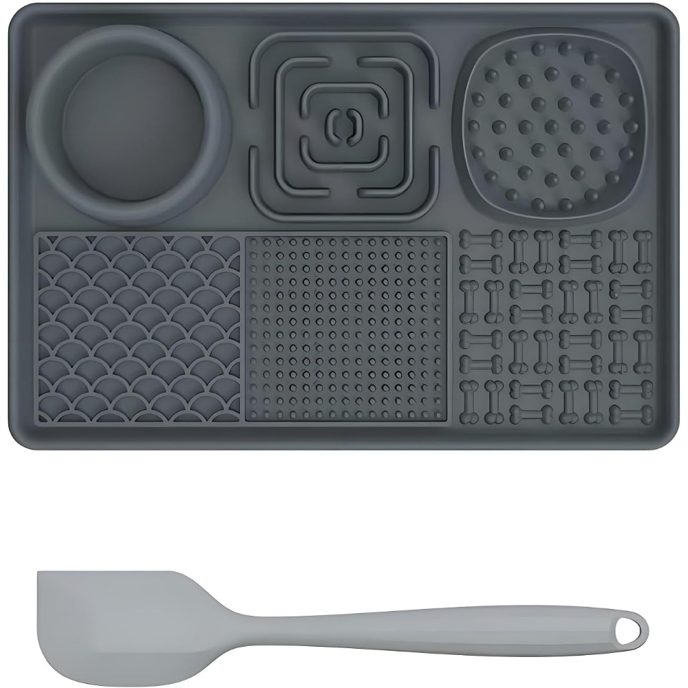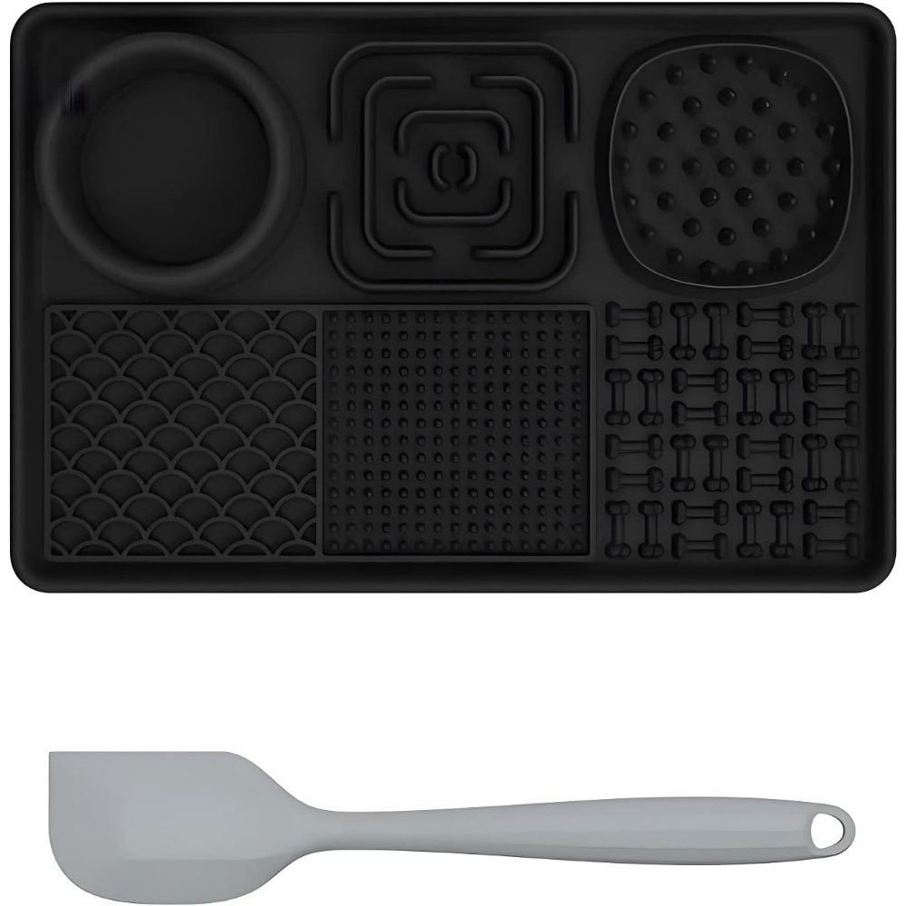 【Safety Material-Food Graded Silicone Lick Mat】This slow food licking mat made of non-toxic food-grade silicone which meet pet food safety, high temperature resistance, sturdy and durable, bite-resistant, highly flexible and will not break, easy to use to ensure your pet safe use. 【Slow Feeding Lick Pad- Improves Digestion, Relieve Anxiety】Some studies have shown that slow eating contributes to a dog's health. The feeding mat can effectively slow down the feeding speed of pets and extend the feeding time. Improve pet eating habits and digestive problems, prevent pets from overeating, indigestion, vomiting and bloating. The licking mat also can help dogs release endorphins, relieve anxiety, and inhibit destructive behavior. A perfect gift for your dogs. 【6-Quadrant Design-For Different Food】This lick mat designed with 6 areas different pattern designs, suitable for different foods. Designed with a water bowl and 2 slow food areas to put solid food such as dog food, snacks, beef jerky... 3 different licking areas can be applied with different liquid foods, such as yogurt, peanut butter, etc. The lick mat not only make a slow feeding to calm your pet but also clean pet’s tongue and teeth. 【Lick Mat with Suction Cups & Easy to Clean】The Dog Slow Feeder Pad designed with many suction cups which can be stick on different materials such as hardwood,tile,glass,fridge. The dog lick pads tightly adsorbed on floor to avoid from sliding and spillage or stick to the shower wall to make sure easier bathing. The slow feeder mat is super easy to clean, no matter hand wash or dishwasher. We sent a spatula and brush for cleaning crevices and hygienic dead spots. 【Great Customer Service】Our slow feeding pad have 5 different color