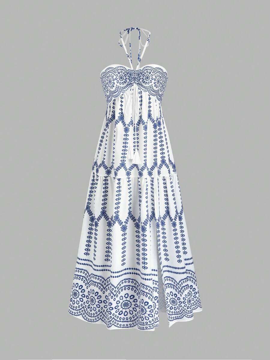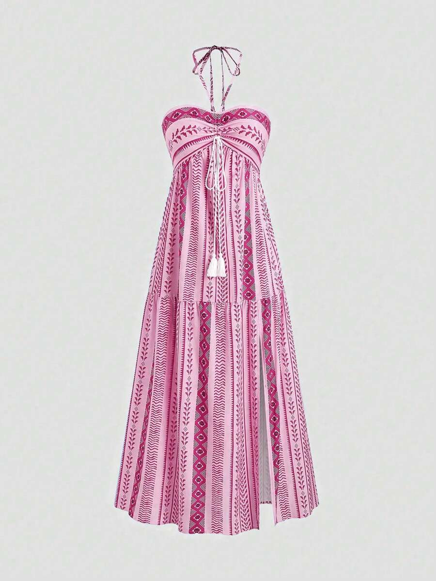 Women's Summer Dress Boho Print Halter Sleeveless Split Hem Long Cami Dresses