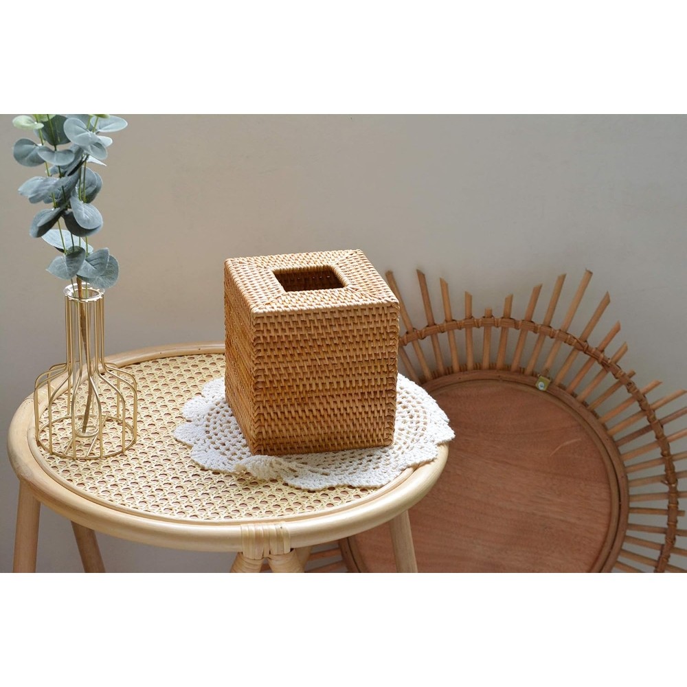 【Material】 Made with durable Eco-friendly Rattan, add a dash of style to your living space with this tissue box cover. 【Size】 5.5 x 5.5 x 5.5 inch. Please measure your tissue box to verify dimensions. 【Design】Open-bottom design allows quick change-outs of empty tissue boxes. 【Use for】Use this tissue holder in any room, from living rooms to bedrooms to bathrooms. Also a perfect decoration for your home. 【EASY CLEANING】 Clean the tissue box cover with a damp cloth and keep dry after cleaning.