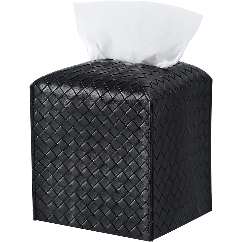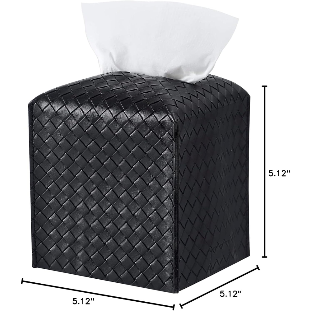 PREMIUM MATERIAL: Made of premium PU leather, our tissue box cover sturdy, soft, smooth, and easy to clean. You can clean it with a damp cloth. EASY TO REFILL: In order to make the facial tissue box holder easy to be refilled, we designed it with velcro belt on the bottom, what you need to do is just open the velcro belt and tuck the tissue box into the tissue box cover. STYLISH AND CLEAN DESIGN: The decorative tissue box holder looks stylish and clean, which would be an inexpensive way to take your decor to the next level. CONVENIENT TISSUE BOX: Built-in widened slit on top for dispensing the tissue paper, you can reach paper easily without tearing the paper in the box to pieces. With compact figure, The tissue box cover is perfect for bathroom, vanity countertop, night stands, inn, tables, keeping the space functional and tissues handy. PERFECT SIZE: 5.12 L in × 5.12 W in × 5.12 H in, the cute tissue cover is suitable for most kinds of soft packaging towel paper.