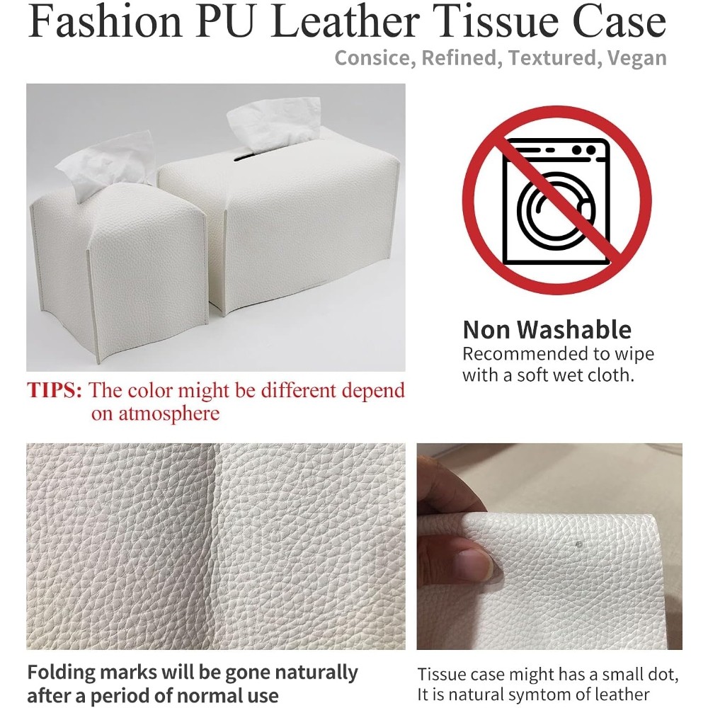 简洁明了:纸巾盒套方块由耐用的优质 PU 皮制成。时尚的装饰纸巾盒收纳盒简洁精致,做工精良。干净、简洁、现代的设计非常适合家居装饰和办公室使用,是您房间设计中不可或缺的一部分,可与任何室内装饰相得益彰。它是隐藏纸巾盒的最佳选择。 方便存放:用这款时尚的盒盖装扮标准的方形纸巾盒;轻松隐藏纸板纸巾盒。纸巾盒盒体可折叠重复使用,便于存放,还能毫不费力地恢复原状。易于清洁,只需用湿布擦拭即可。 易于填充:只需打开底部的魔术贴带,即可轻松更换空纸巾盒。 理想尺寸:皮质纸巾盒套的尺寸为 5.0 X 5.0 X 5.0 英寸,采用方形设计,与所有流行的方形纸巾盒兼容,可方便地放置在家中或办公室的任何房间。 您将得到什么:高品质 PU 皮纸巾盒套,它是家庭、办公室和汽车的好礼物。高品质 PU 皮纸巾盒套,是家庭、办公室和汽车的好礼物。非常适合日常生活中的桌子、床头柜、桌面、厨房台面、梳妆台和书桌、客厅。它是乔迁之喜、房屋装饰等的最佳礼品。