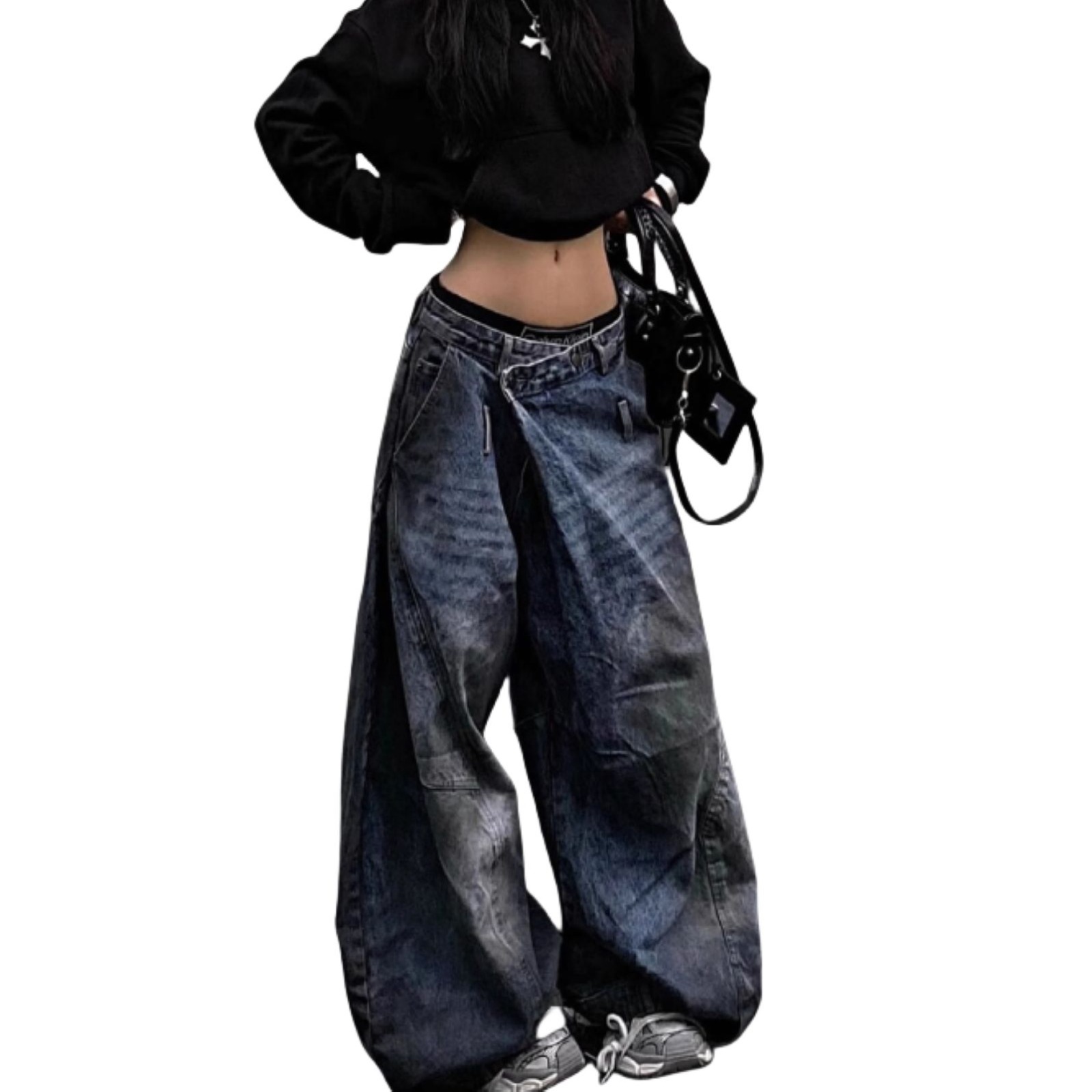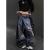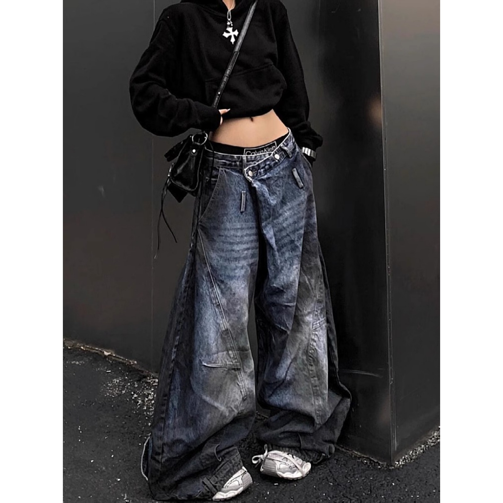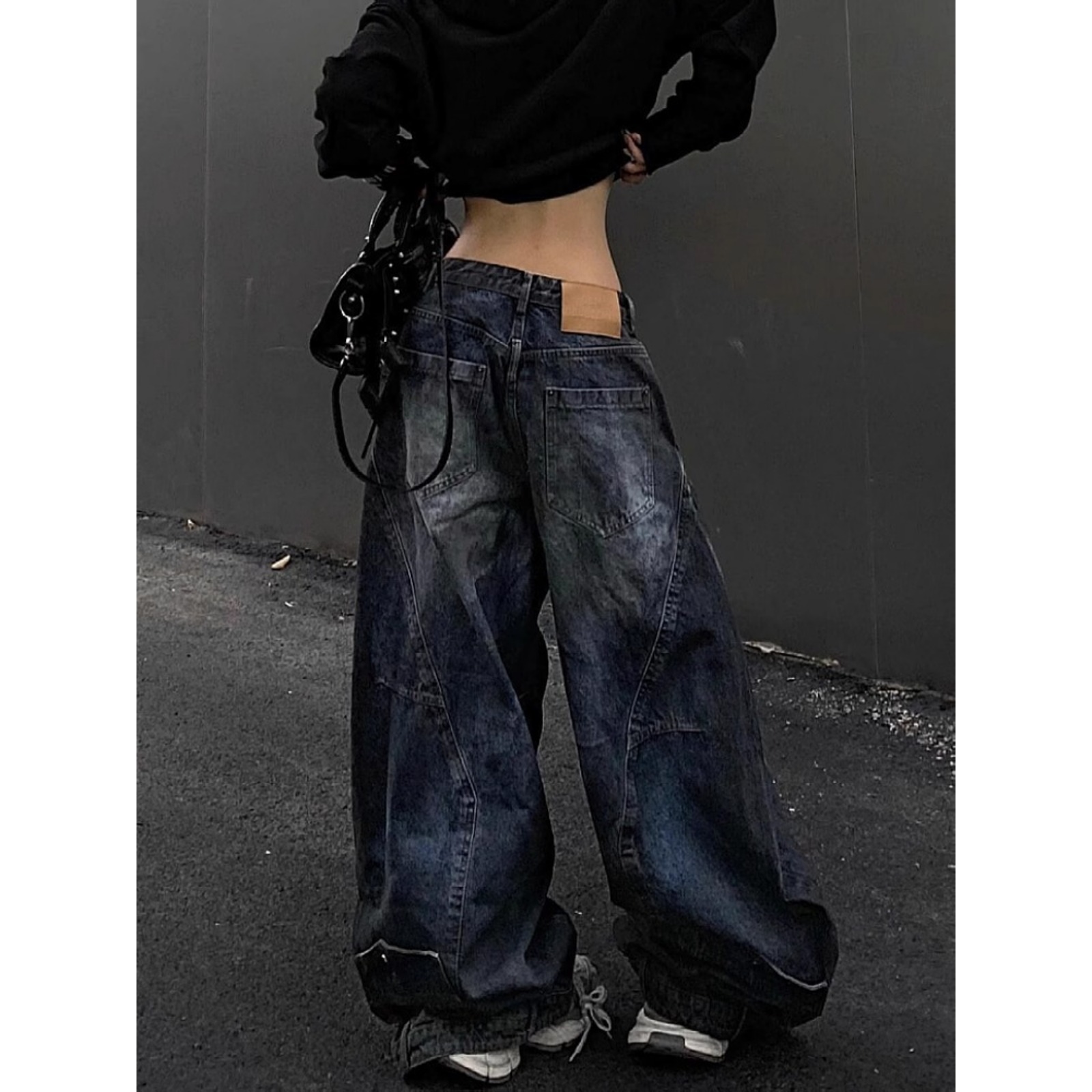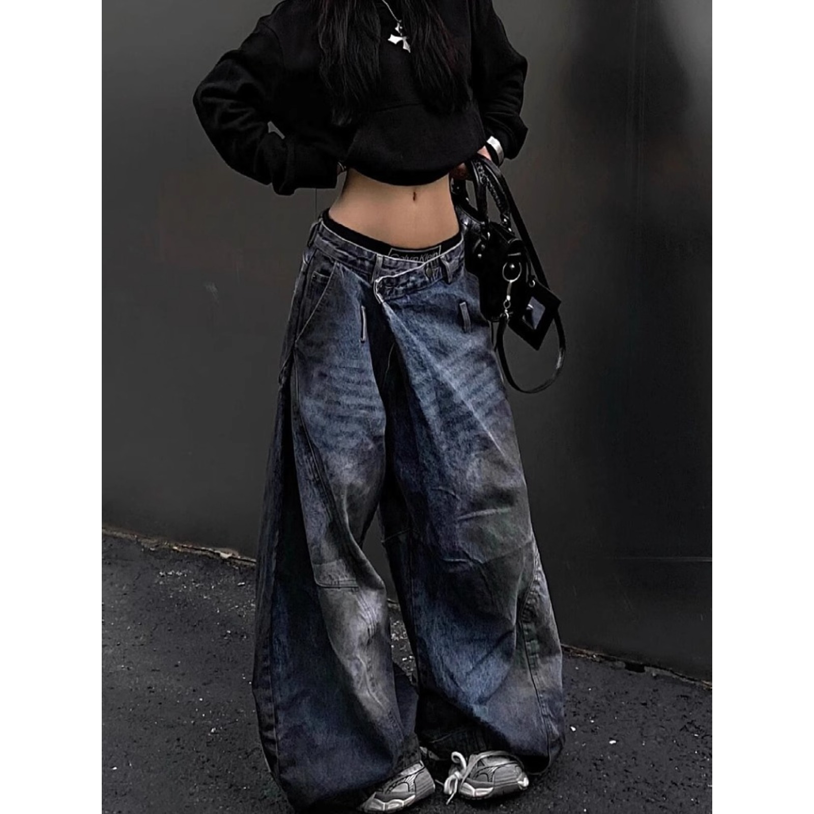 街头做旧牛仔裤女春秋季新款潮流设计感反转腰头阔腿长裤