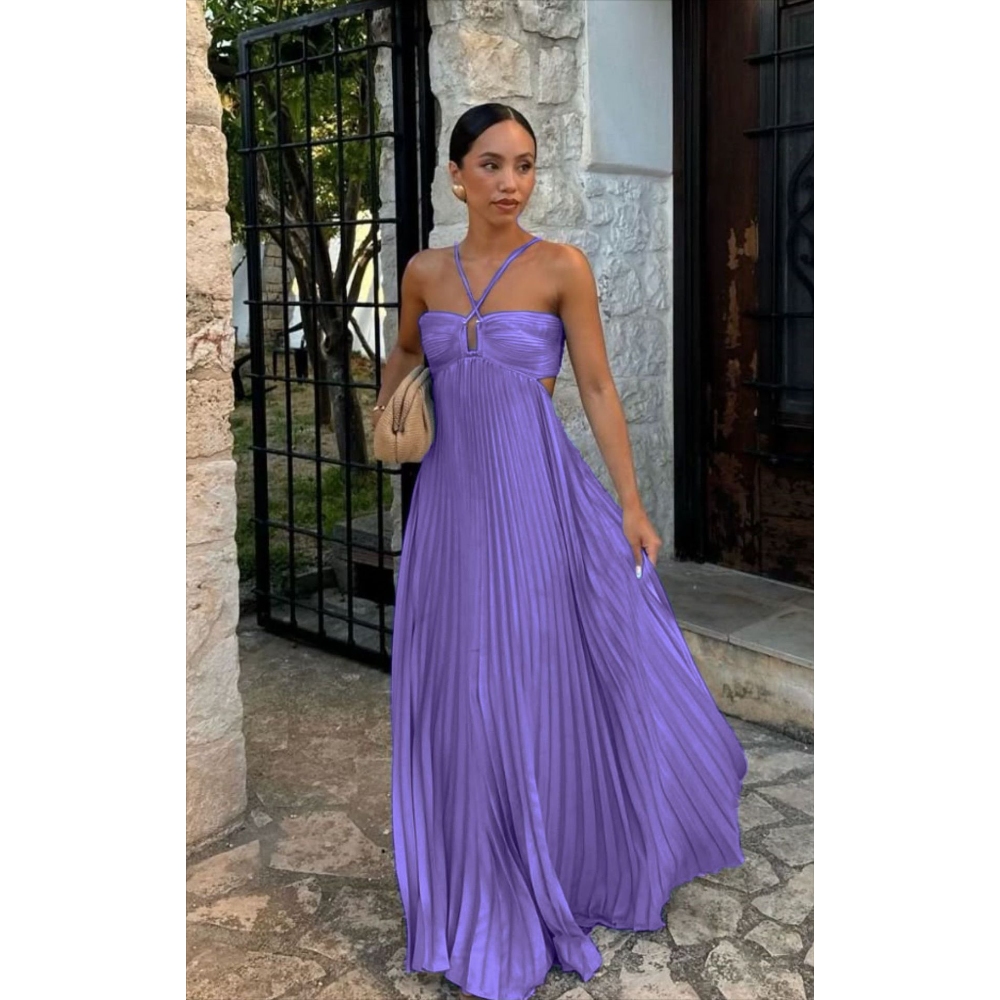这款连衣裙由优质聚酯纤维制成,轻盈耐用,即使经常穿着也能保持光滑和活力。透气面料让你在炎热的夏天保持凉爽舒适,同时保持奢华的感觉 [设计特点] 精致的细肩带和无袖露肩设计打造出优雅迷人的外观,突出了你的锁骨和肩膀。无袖设计增添了一丝精致感,非常适合展示阳光亲吻的肌肤。背部镂空展现出微妙的肌肤,为连衣裙增添大胆性感的元素。飘逸长裙其特点是复杂的褶皱,增加了质感和运动感,创造出戏剧性和女性化的轮廓。单色调色板散发出永恒的优雅,让连衣裙的设计细节成为焦点。
