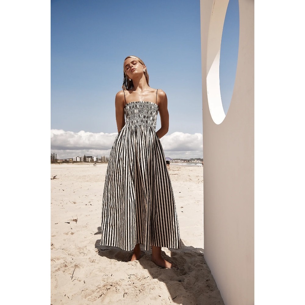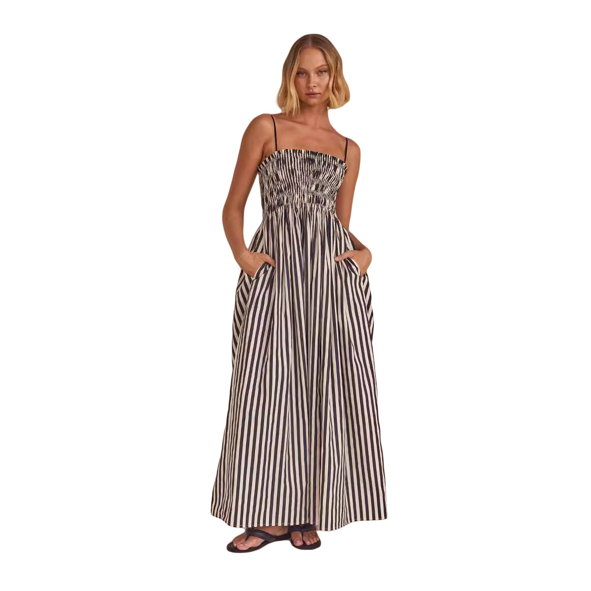 25年欧美跨境春夏款条纹打揽橡筋性感大摆插袋吊带连衣裙