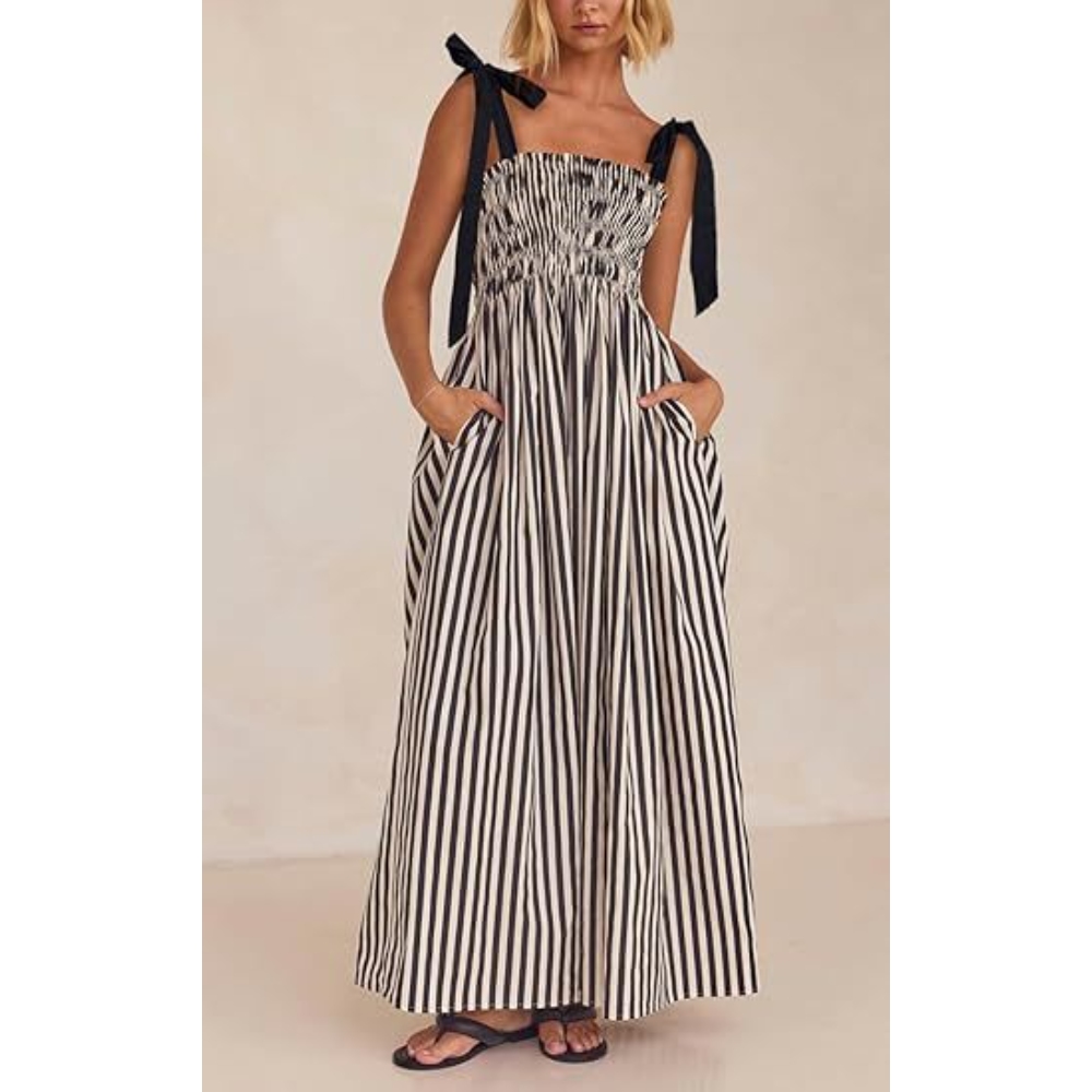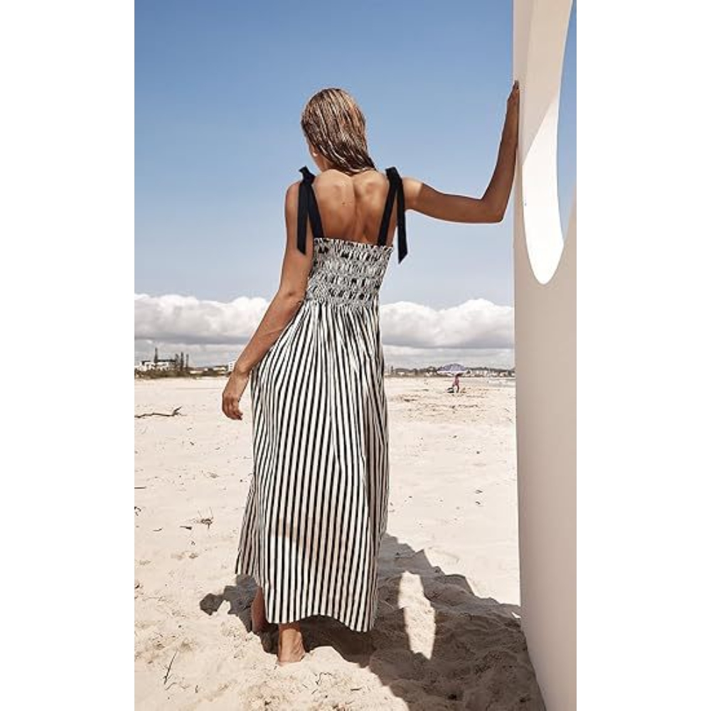 Women's 2025 Summer Striped Smocked Tube Spaghetti Strap Swing Dress Sexy Backless Sleeveless Boho Maxi Sundress with Side Pockets Flowy Vacation Beach Dress