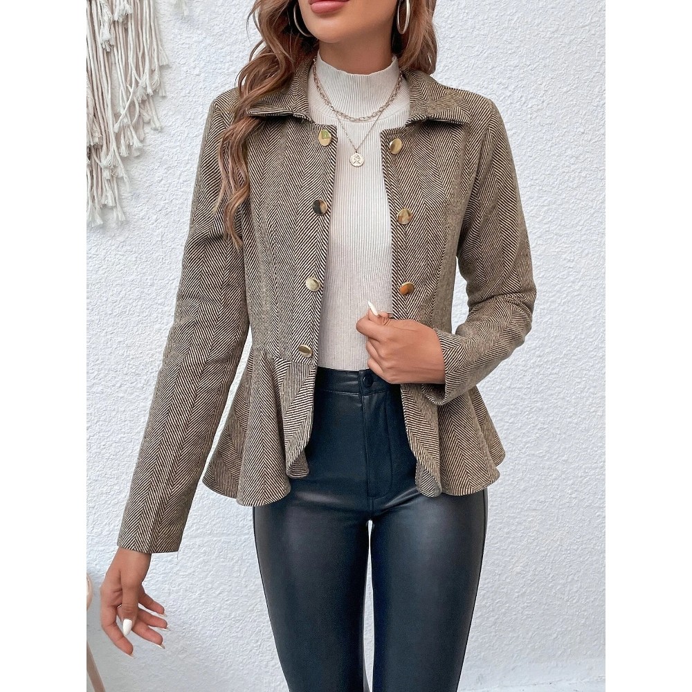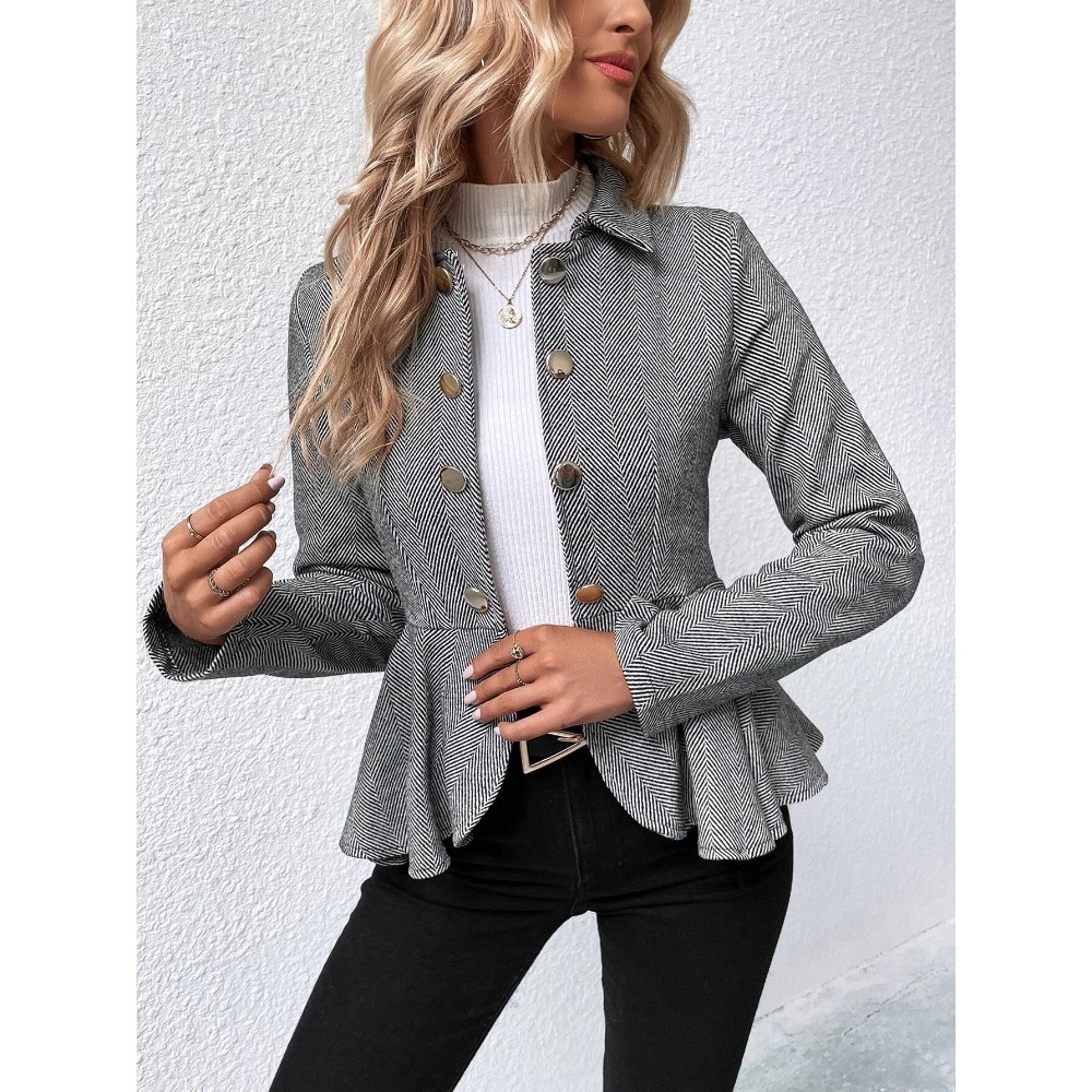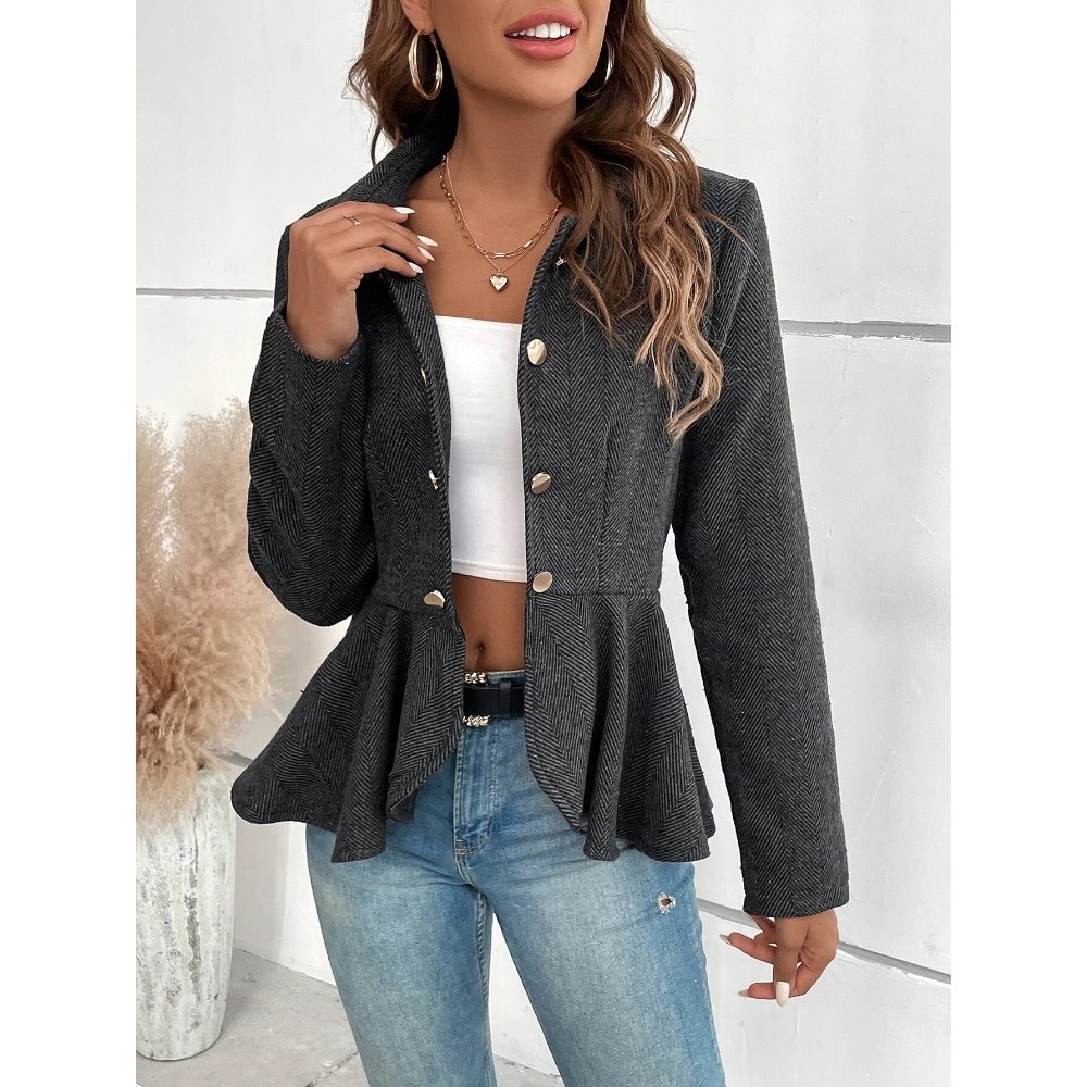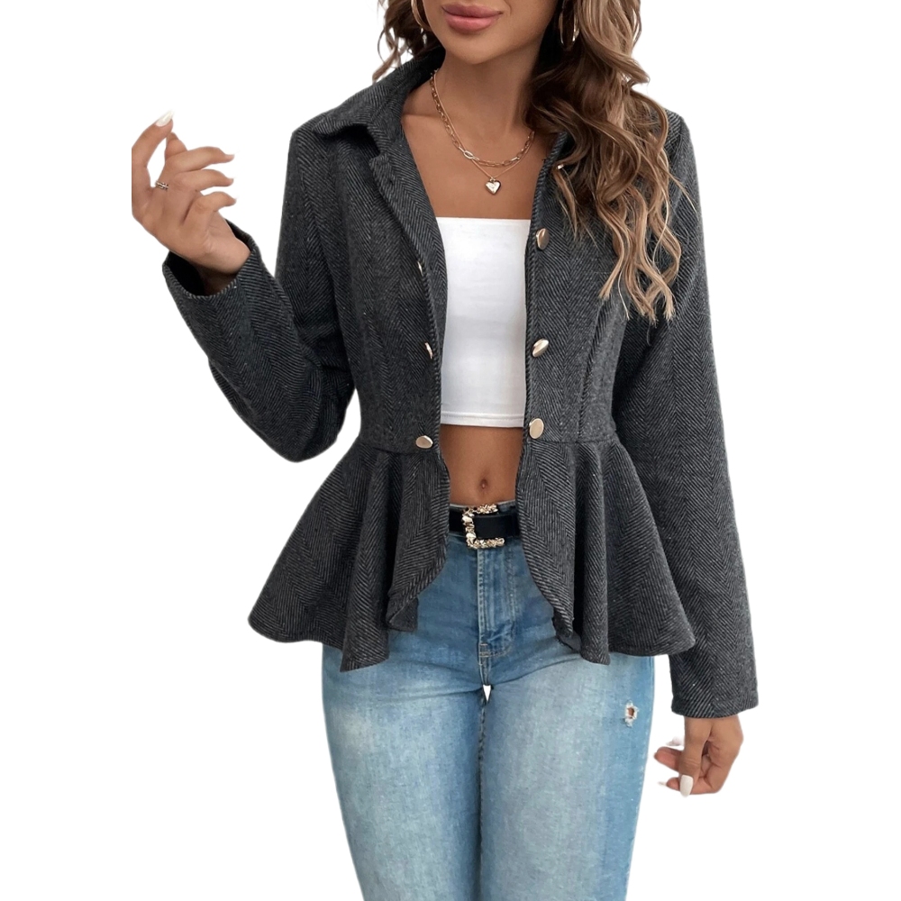 [Polyester Material] This suit jacket is made of high-quality polyester fiber and has an excellent three-dimensional contour, ensuring an elegant appearance in professional occasions. This fabric combines durability and smooth texture, making it an ideal choice for office wear all year round  [Design Features] The classic lapel double breasted design creates a refined and timeless aesthetic, while the slim fit enhances the figure with a smooth and feminine cut. The double breasted design adds a touch of retro charm to modern workwear. The structured lines of the ruffled hem soft suit jacket blend professionalism and romance together. Jacquard craftsmanship features subtle geometric patterns that add texture and visual interest without overwhelming the design