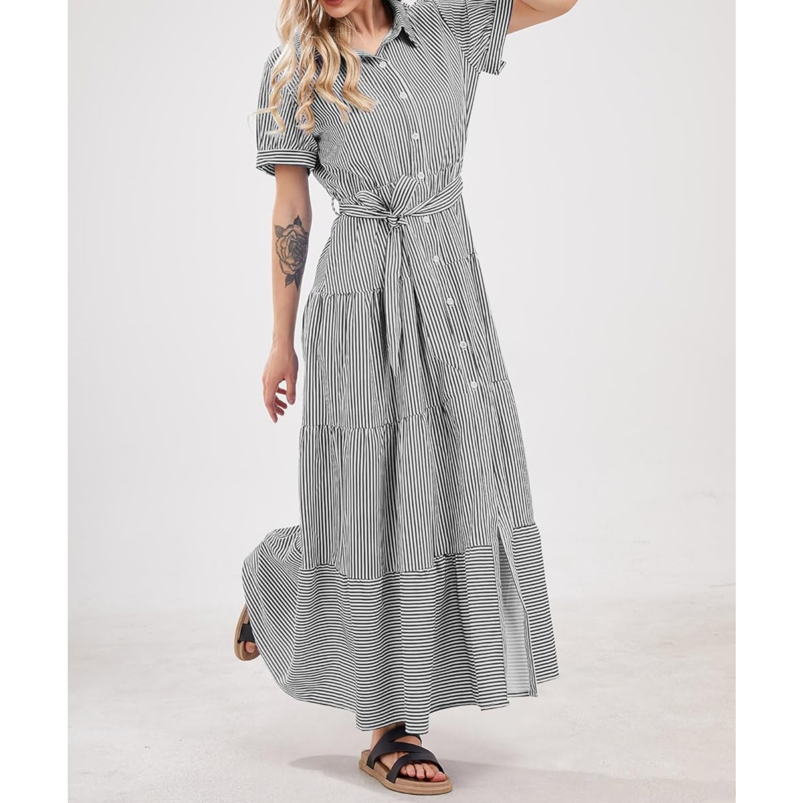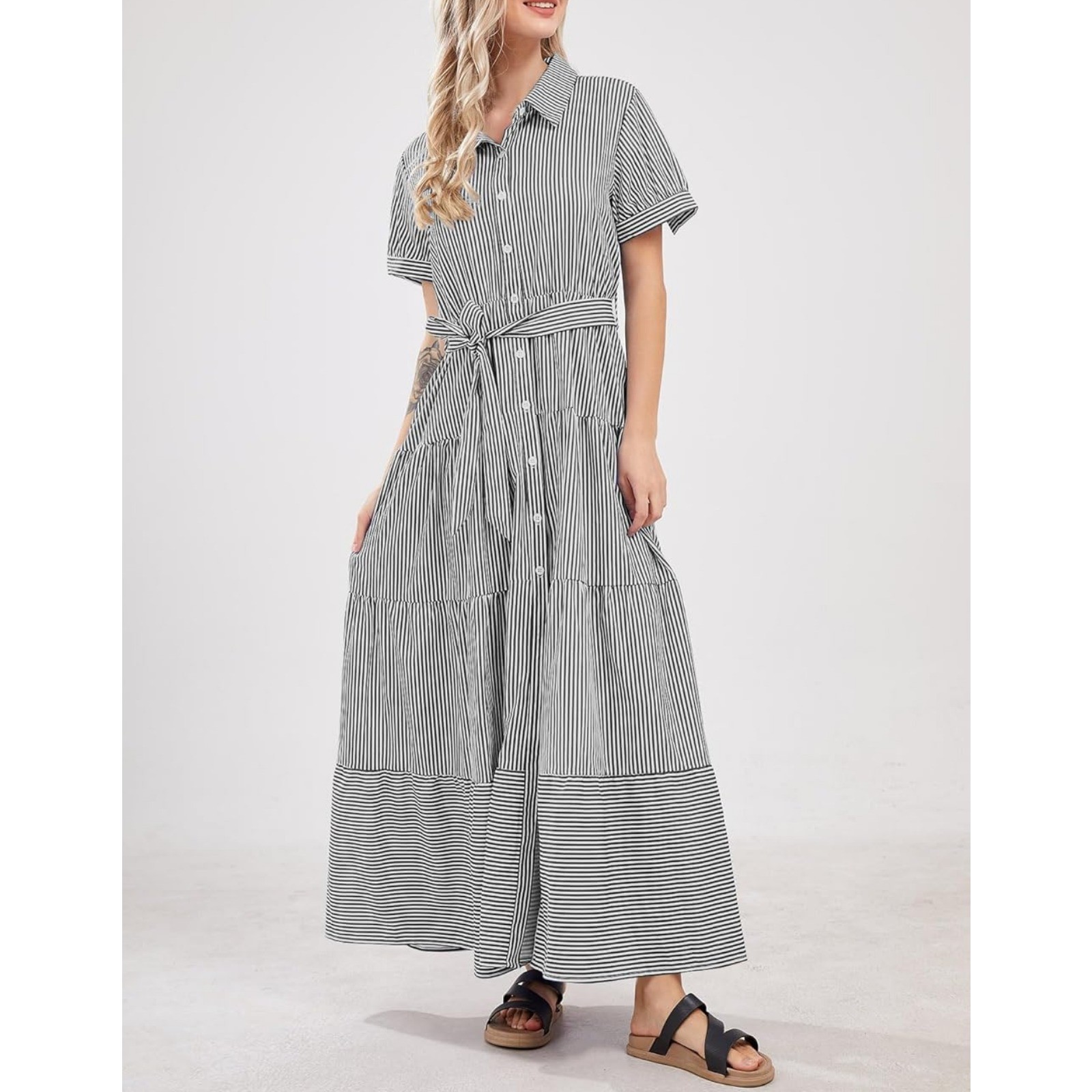 Womens Casual Short Sleeve Button Down Tie Waist Ruffled Striped Maxi Shirt Dress