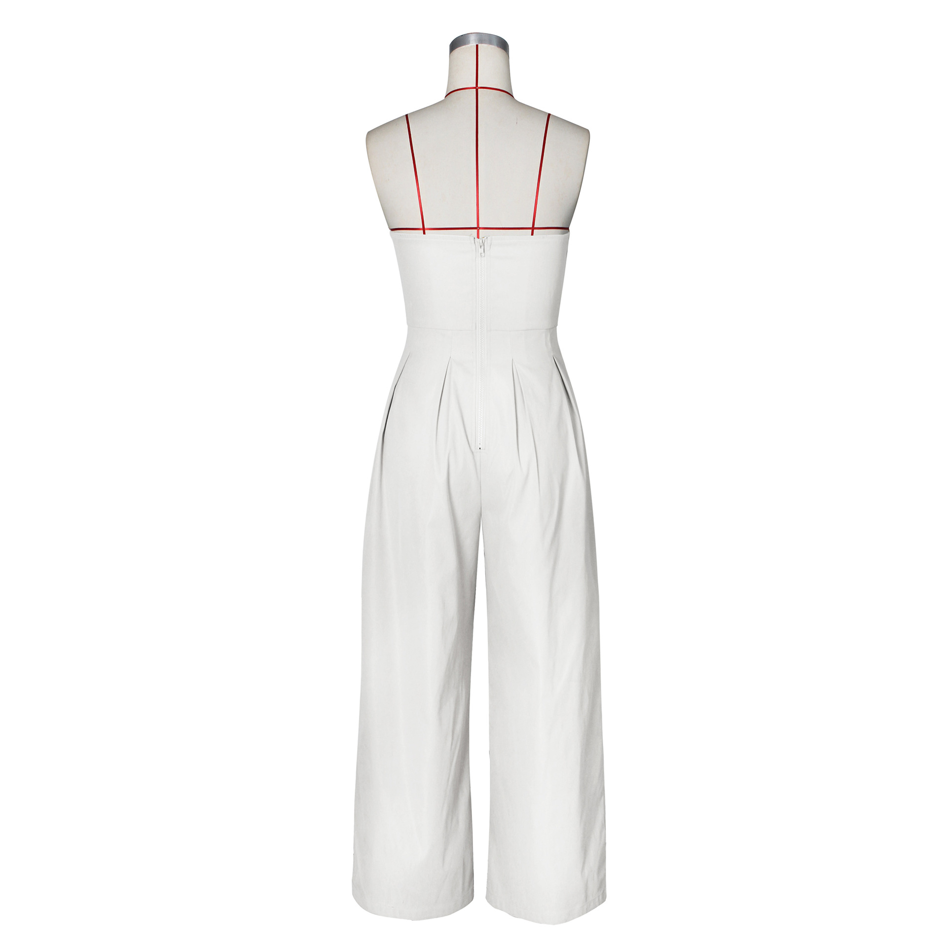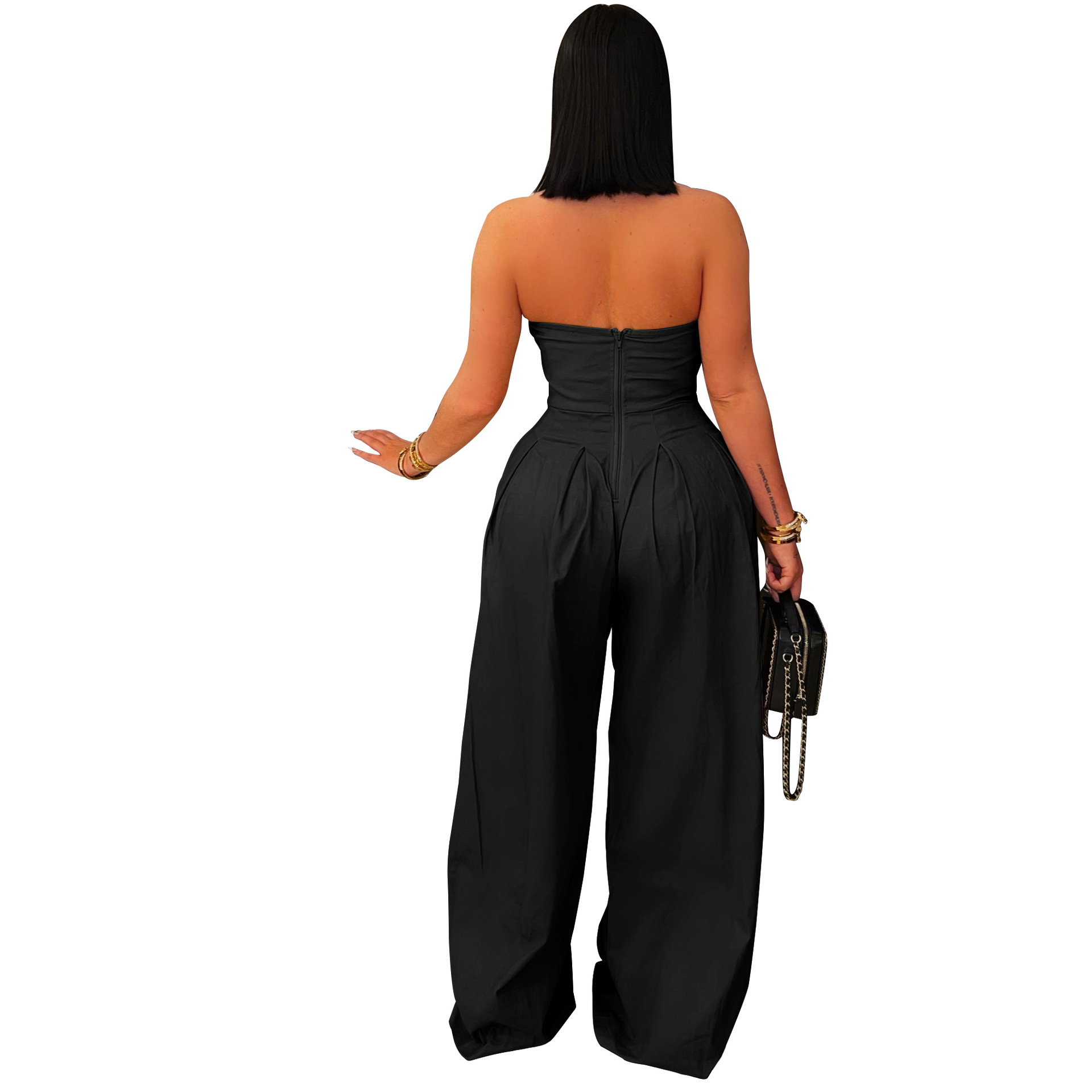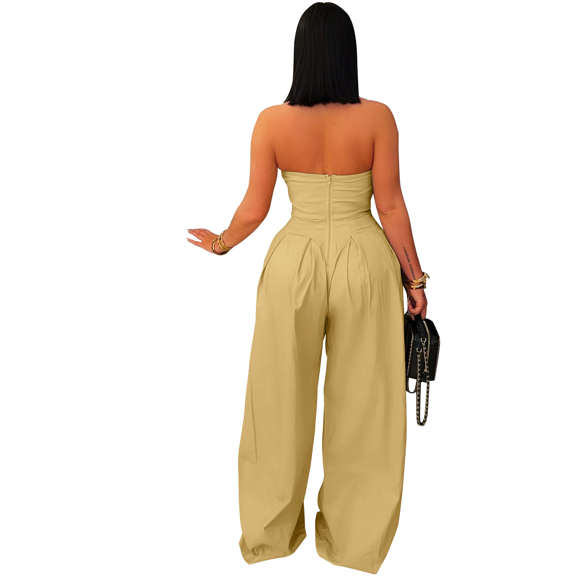 [Polyester & Spandex Material] This jumpsuit is made of a high-quality blend of polyester and spandex, with a smooth touch and a snug fit that can maintain the shape well. This fabric has durability and breathable comfort, making it an ideal choice for all day elegant wear   [Design Features] The sleeveless off shoulder design showcases the collarbone and shoulders, while the strapless cut creates a sexy appearance. The front metal buttons add an avant-garde look to the fitted corset. The back zipper ensures easy wearing. Clever tailoring creates a sharp contrast between the tight corset and wide leg pants, creating exquisite contours. The pleated loose leg pants are elegant and loose, creating graceful movements with every step. The solid color design exudes a minimalist luxury, making jumpsuits a versatile accessory