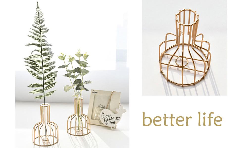 Features: Vase decoration supports fake flowers, dried flowers, live flowers, live plants. Vase set can be used as a local decoration for your office, coffee shop, coffee table, dining table, coffee shop, etc., the vase is an ideal gift, ladies birthday gift, Christmas, wedding anniversary, etc. Materials The metal frame is made of iron art, and the surface is gold-plated The test tube is made of top quality borosilicate glass