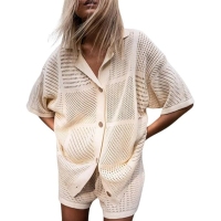 亚马逊欧美新款休闲短袖V领镂空衬衫短裤纯色运动两件套女生套装