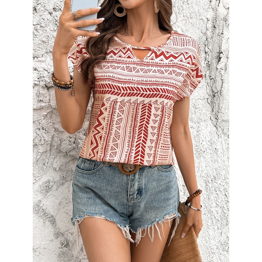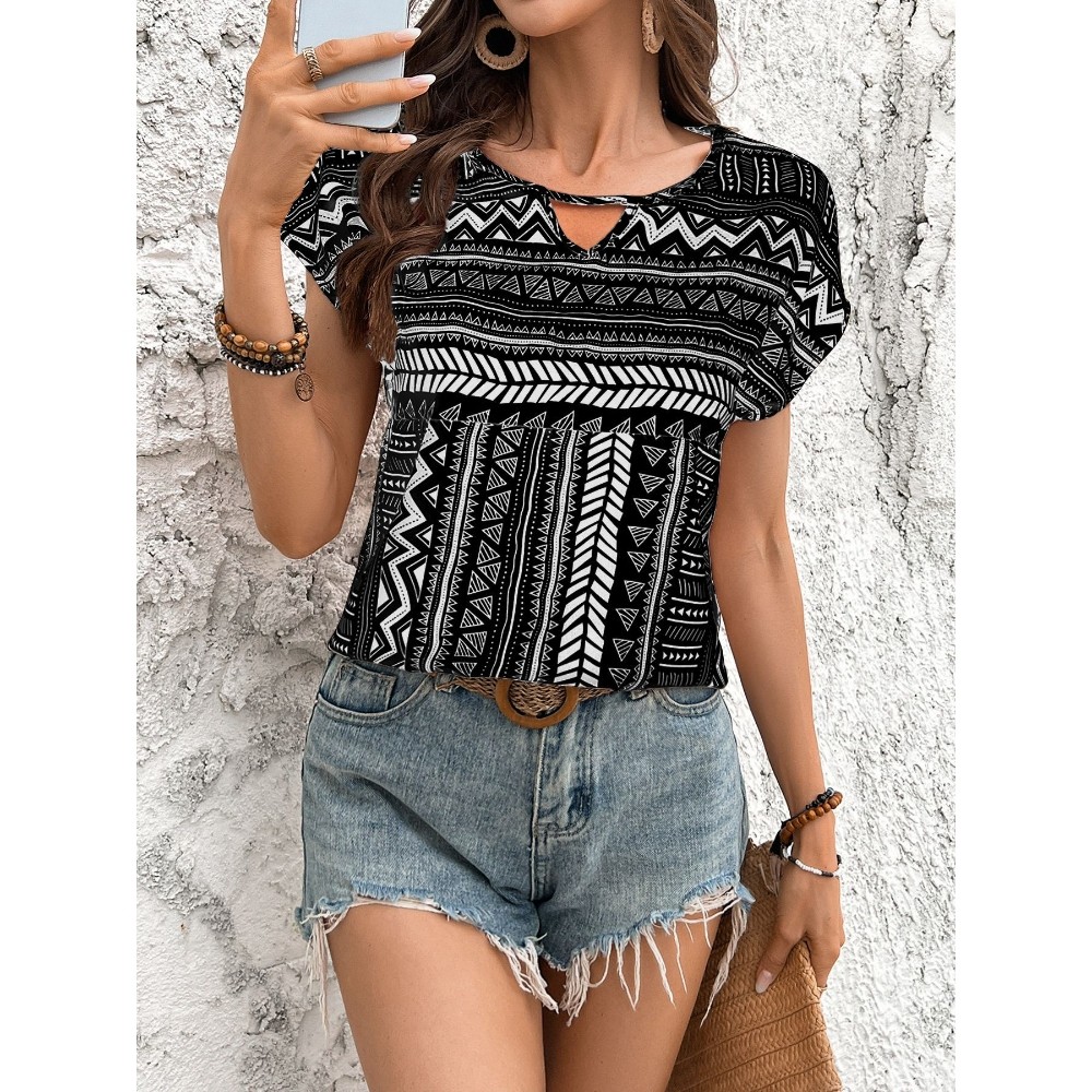 [涤纶和氨纶面料] 这款上衣由涤纶和氨纶制成,结合了涤纶的耐用性和氨纶的伸缩性,轻便凉爽,确保穿着舒适,随心而动,保持身材,是温暖夏日的完美之选。 [设计特点] 这款圆领帽袖上衣采用经典的圆领设计,独特的镂空设计增添了一丝神秘感和时尚感。短款帽袖设计形成了一个引人注目的焦点,恰到好处地展现了肌肤。宽松飘逸的下摆优雅空灵,让人看起来毫不费力。这款上衣采用大胆的几何印花装饰,展现了轻松休闲的现代时尚美感。
