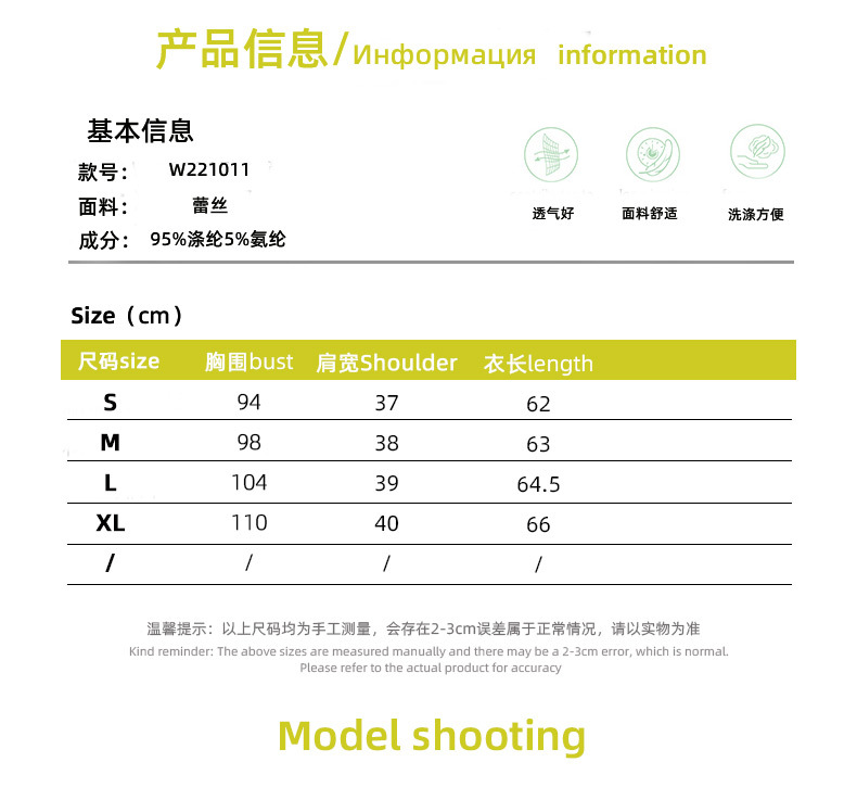[涤纶和氨纶面料] 这款吊带背心由涤纶和氨纶混纺制成,手感柔软轻盈,弹性恰到好处。这种面料透气性好,非常适合春夏季节穿着,同时还能保持平滑的悬垂感,与圆润的轮廓相得益彰。 [设计特点] 它采用经典的圆领设计,精致的蕾丝细节更显优雅。无袖设计确保在温暖的天气里也能保持凉爽,而衣领上复杂的镂空蕾丝图案则散发出女性魅力。纯色设计增强了它的多功能性,将休闲舒适与细腻精致完美融合。